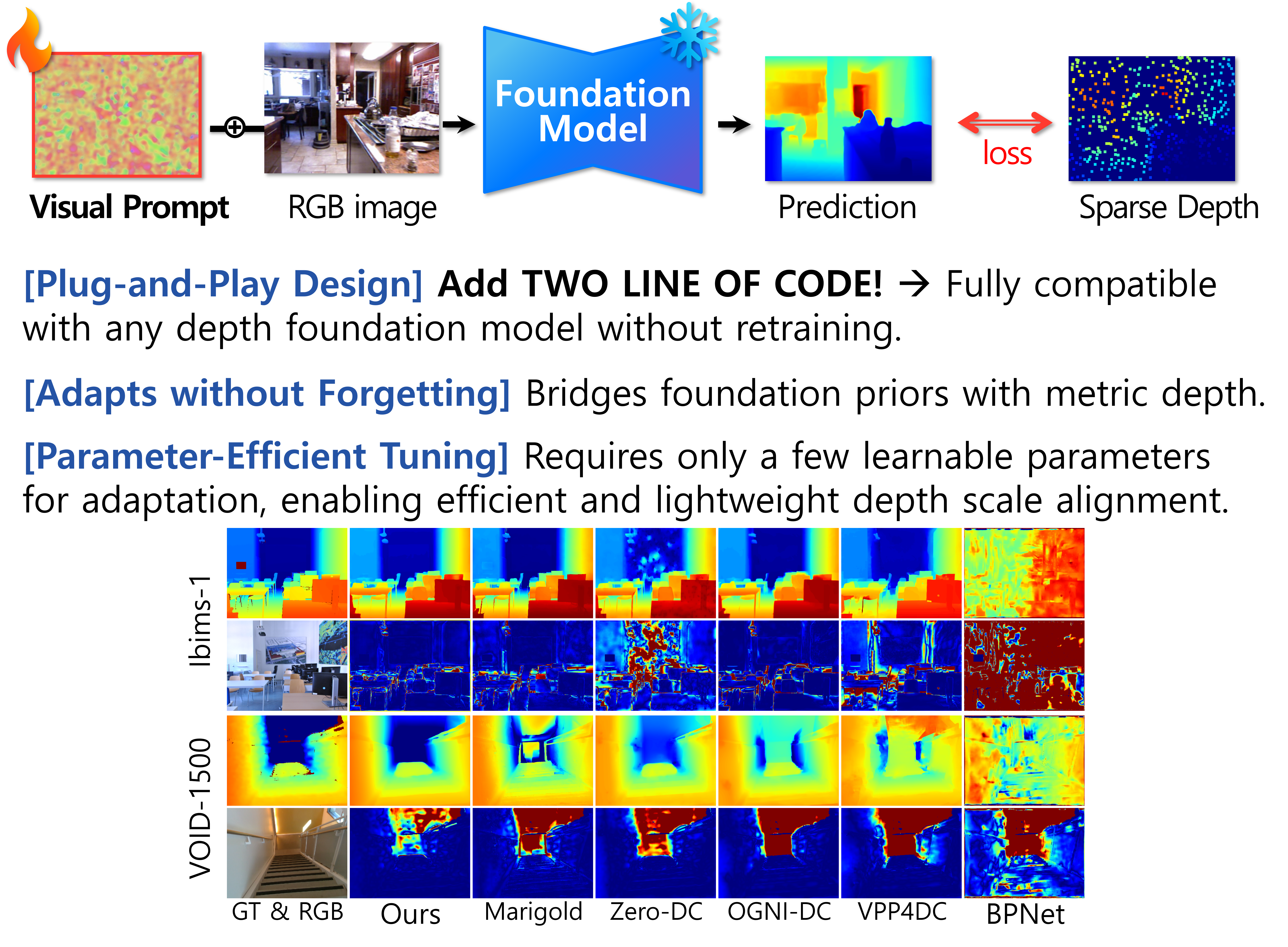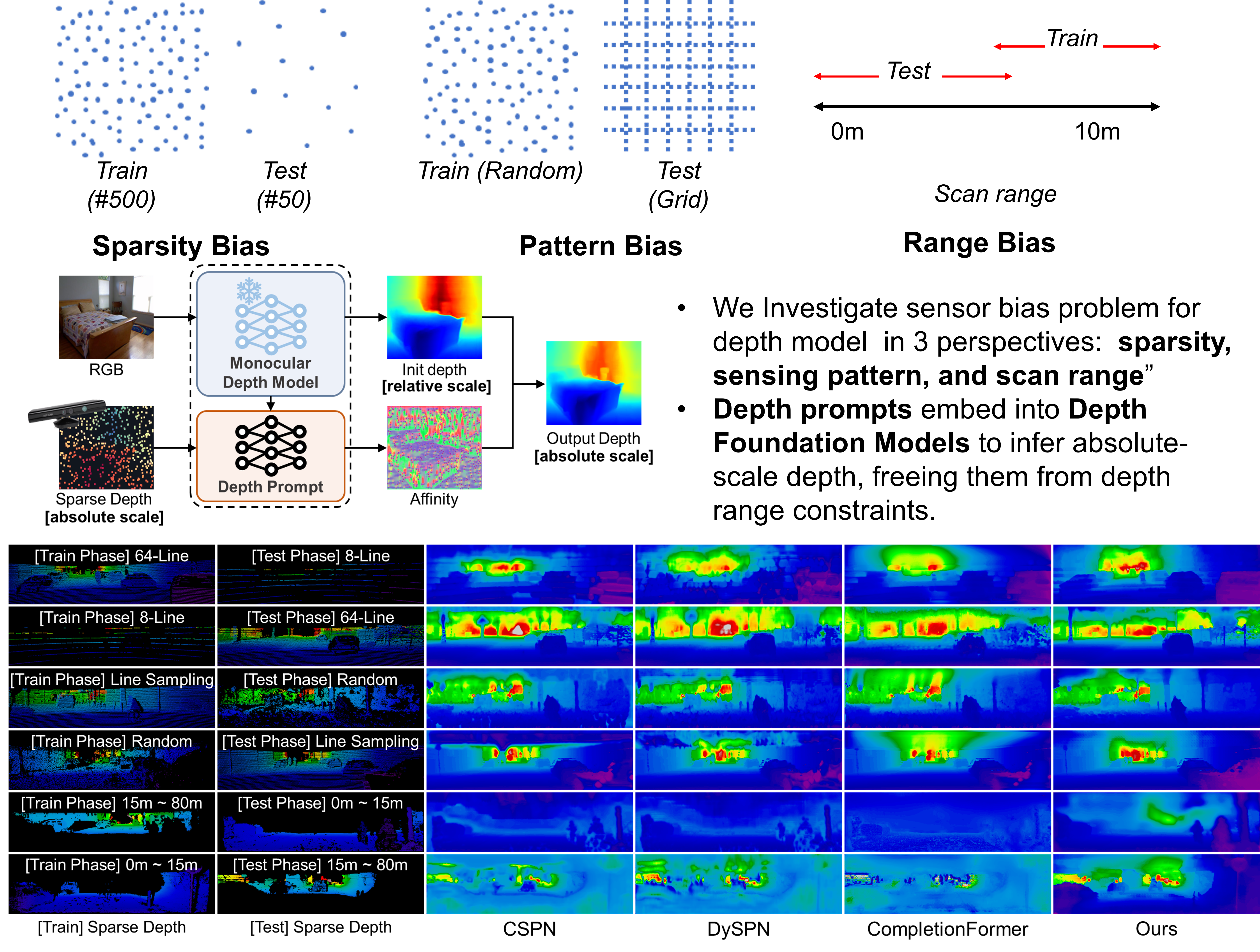 Dense depth maps have been used as a key element of visual perception tasks. There have been tremendous efforts to enhance the depth quality, ranging from optimization-based to learning-based methods. Despite the remarkable progress for a long time, their applicability in the real world is limited due to systematic measurement biases such as density, sensing pattern, and scan range. It is well-known that the biases make it difficult for these methods to achieve their generalization. We observe that learning a joint representation for input modalities (e.g., images and depth), which most recent methods adopt, is sensitive to the biases. In this work, we disentangle those modalities to mitigate the biases with prompt engineering. For this, we design a novel depth prompt module to allow the desirable feature representation according to new depth distributions from either sensor types or scene configurations. Our depth prompt can be embedded into foundation models for monocular depth estimation. Through this embedding process, our method helps the pretrained model to be free from restraint of depth scan range and to provide absolute scale depth maps. We demonstrate the effectiveness of our method through extensive evaluations.