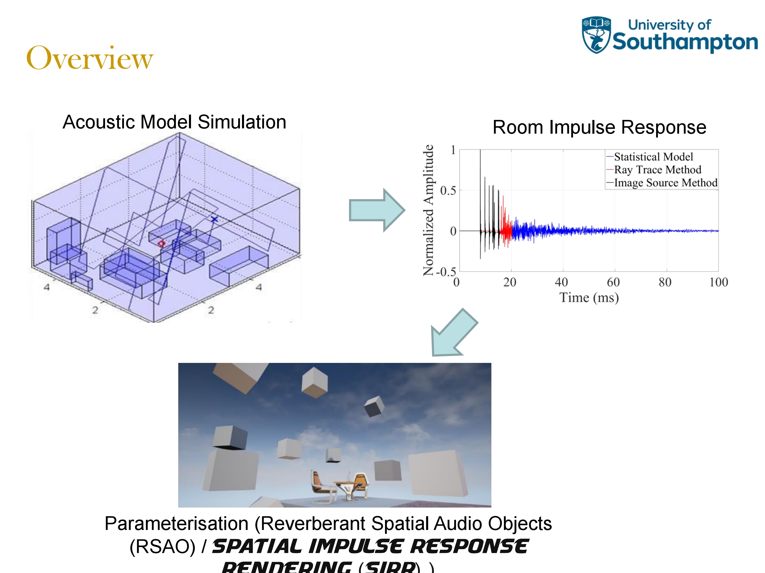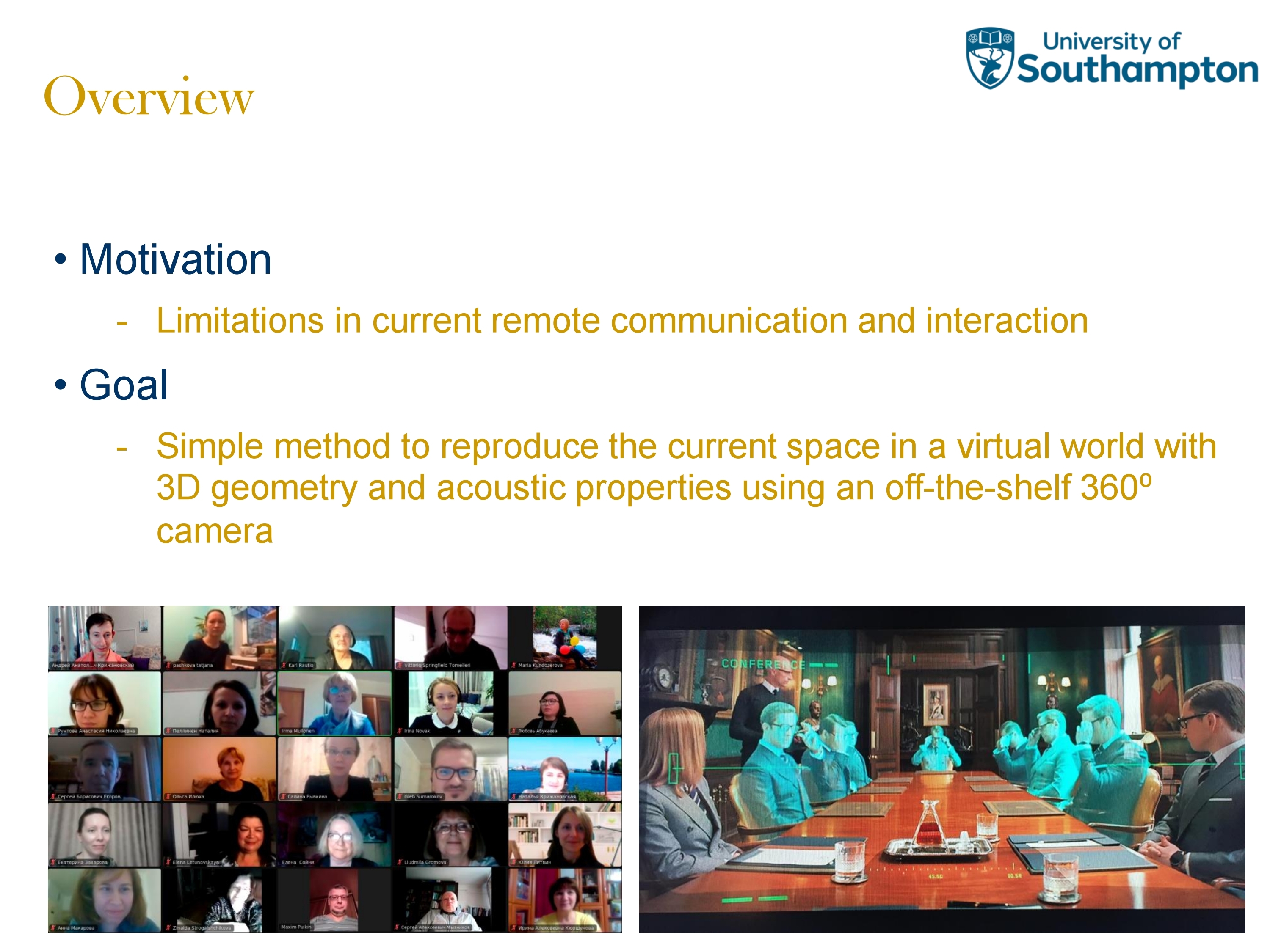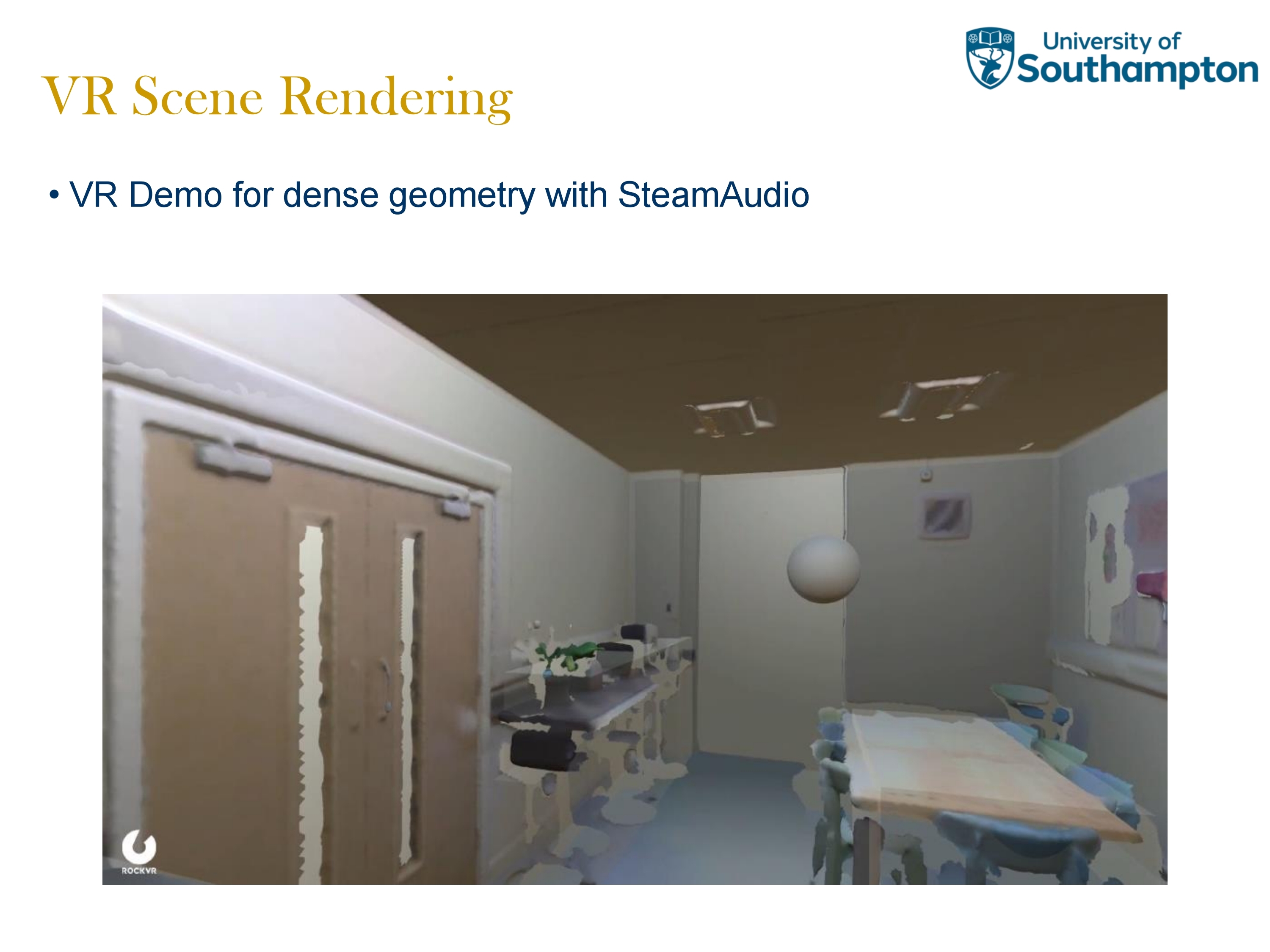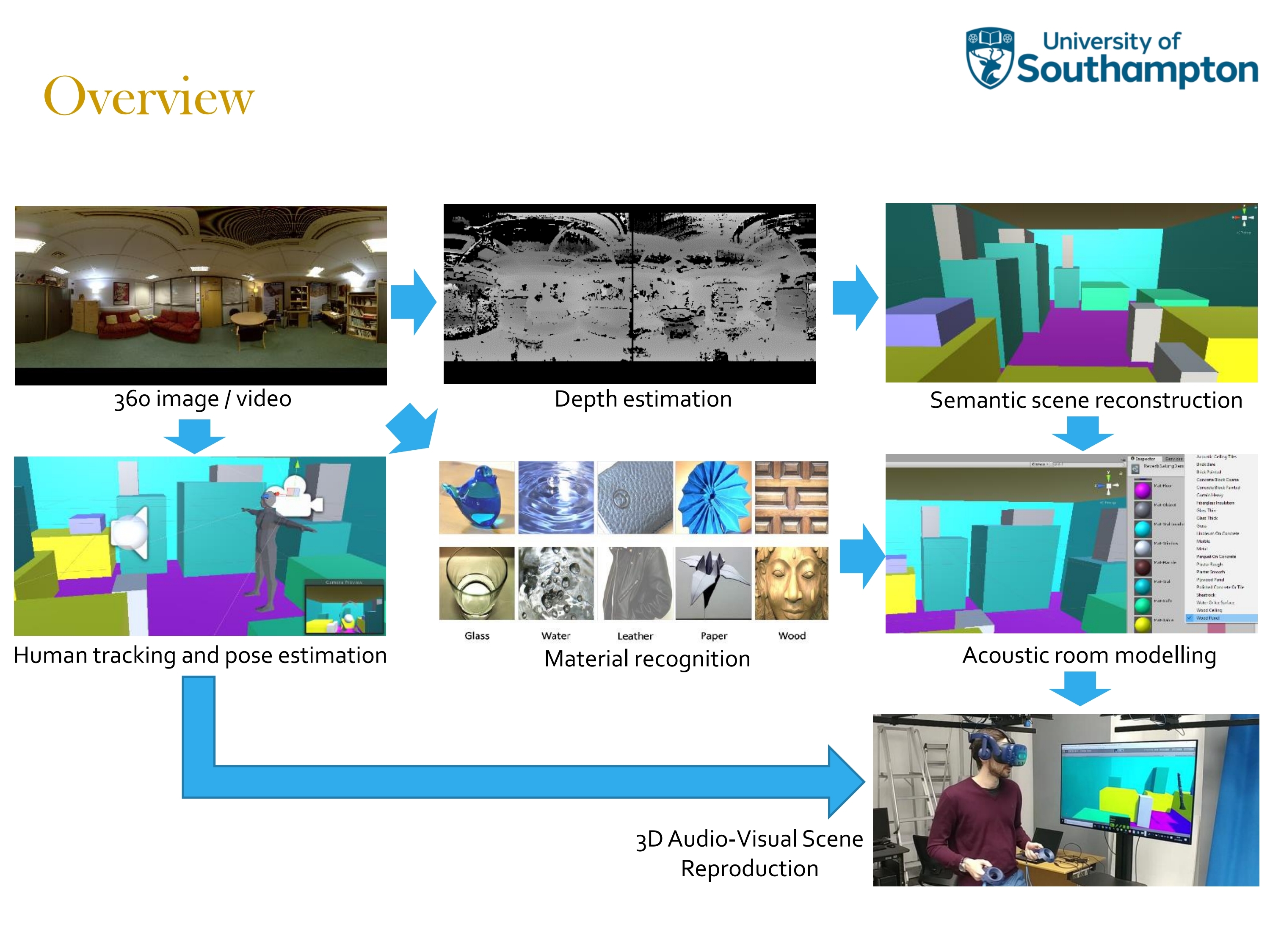Immersive Audio-Visual 3D Scene Reproduction in Virtual RealityAs personalized immersive display systems have been intensely explored in Virtual Reality (VR), plausible 3D audio corresponding to the visual content is required to provide more realistic experiences to users. In this talk, a complete pipeline to simultaneously reconstruct 3D geometry and acoustic properties of the environment from a panoramic (360⁰) image will be introduced. Monocular depth estimation, material estimation and semantic scene completion methods have been developed to estimate the complete semantic scene geometry in order to adopt spatial audio reproduction to the scene.