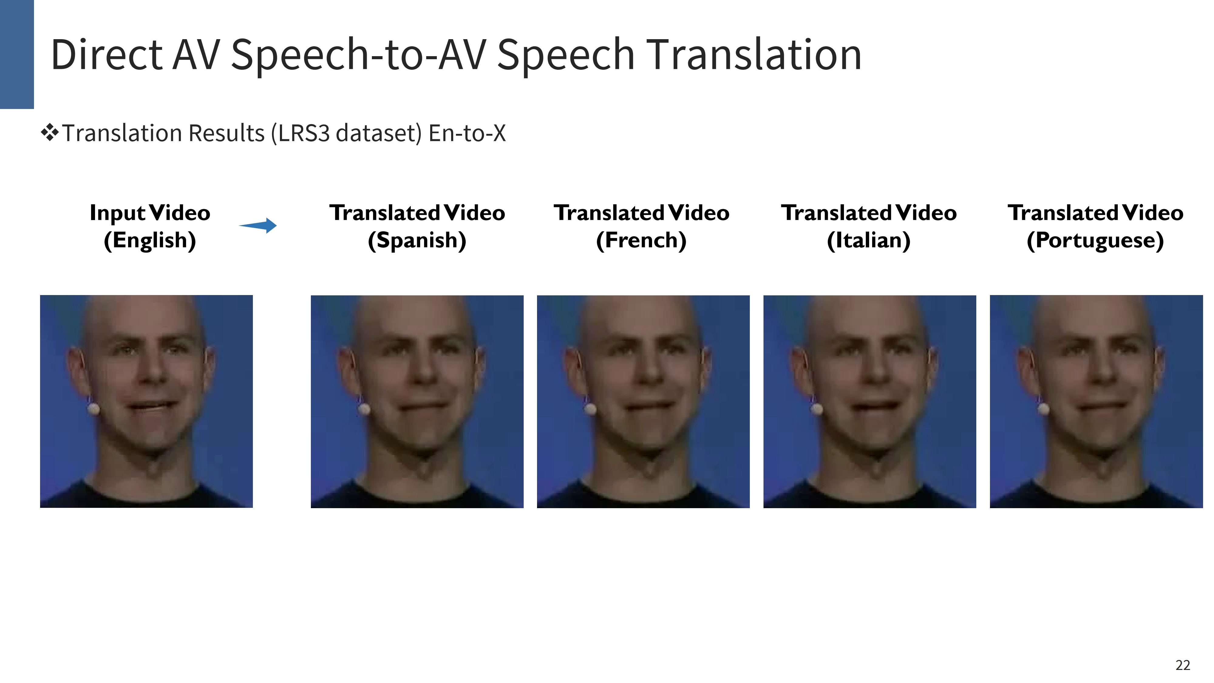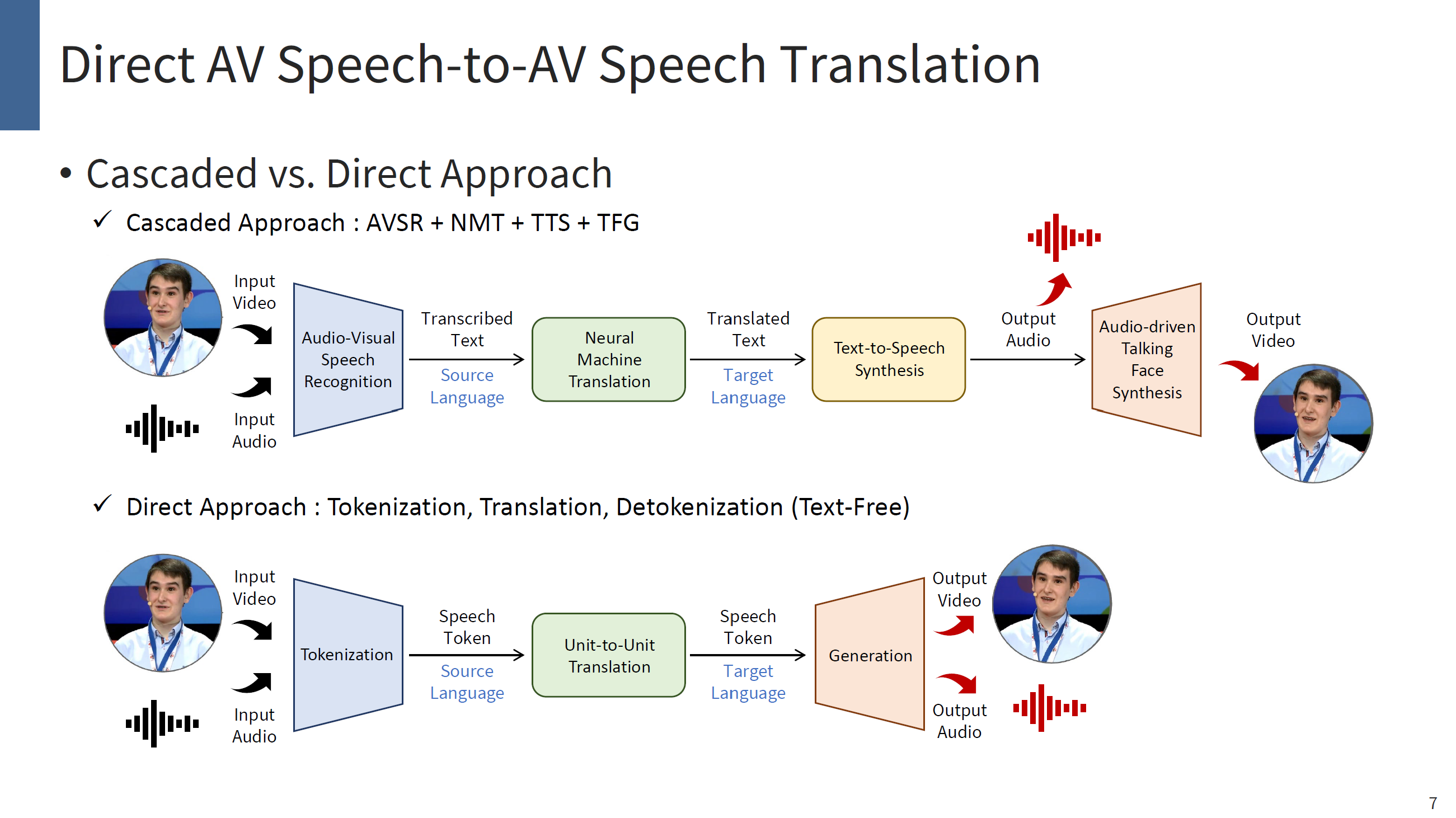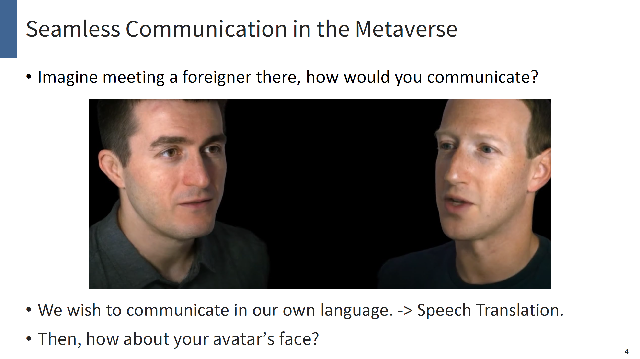 Seamless Communication in the Metaverse: Direct Audio-Visual Speech TranslationLet’s Imagine your self existing in the Metaverse through a Codec Avatar technology. Codec Avatar aims to digitally reconstruct your face and body, allowing you to exist in the VR world as yourself. Therefore, in the VR world, you can meet other people just as you would in real life. Now, imagine you meet a foreigner there, how would you communicate? Since this is a virtual environment, we would like to use our own language. One effective solution is Speech-to-Speech Translation. By translating your speech into the other person’s language, you can communicate seamlessly while still speaking your own language. But what about your avatar’s face, should it continue to reflect your original language? In this presentation, we're gonna see a multi-modal speech-to-speech translation technology, named AV2AV, which simultaneously translates both speech and video modalities into the targeted language. Therefore, with the AV2AV system, we may seamlessly communicate with others by using our own native language in the VR world with the translated voice and lip movements.