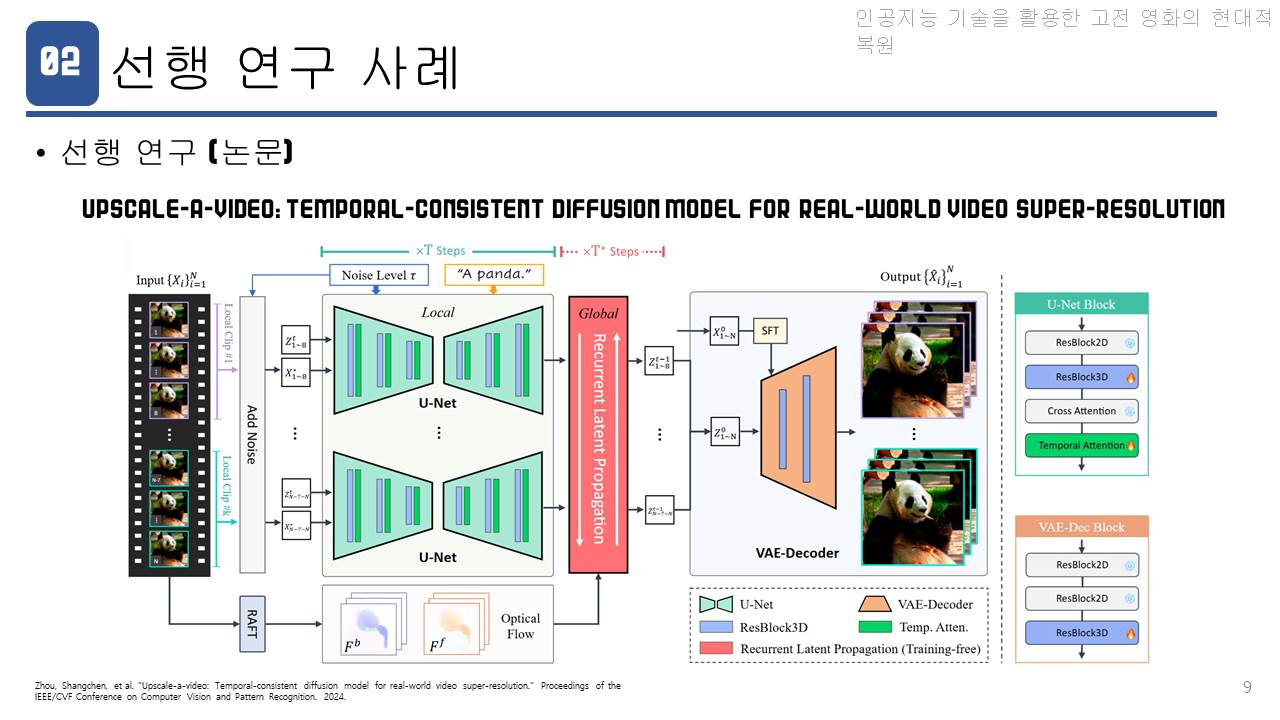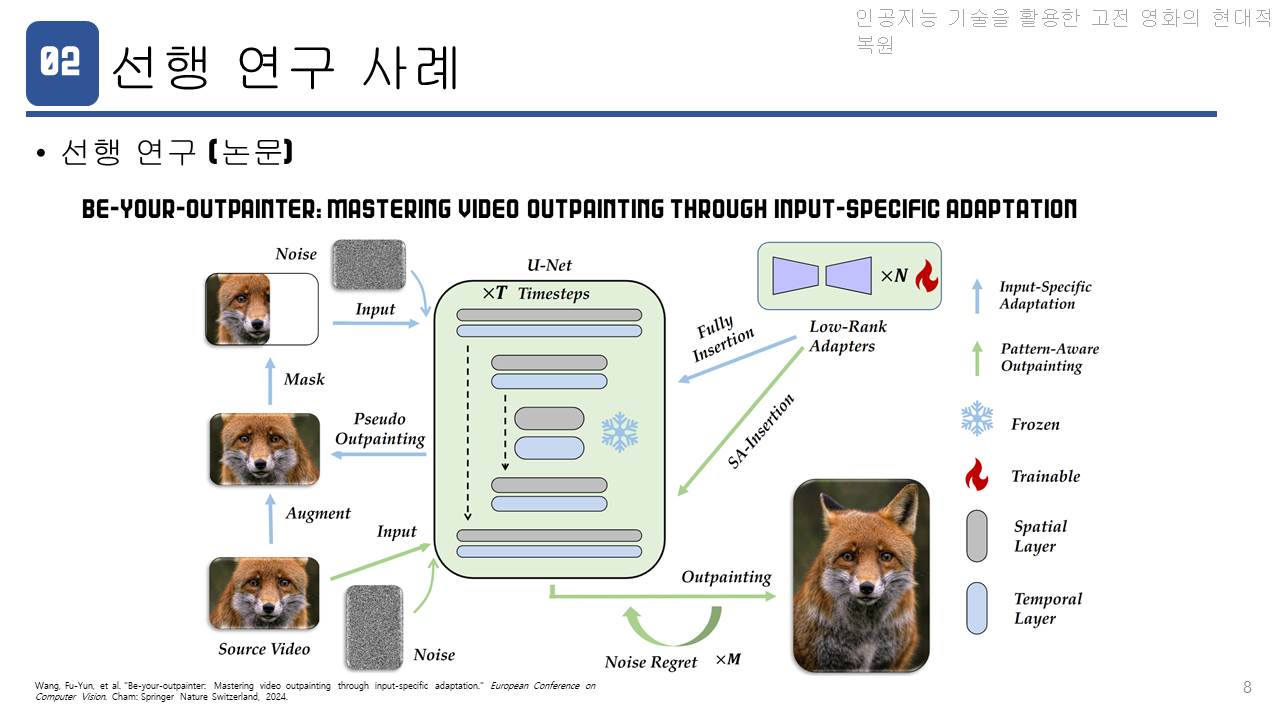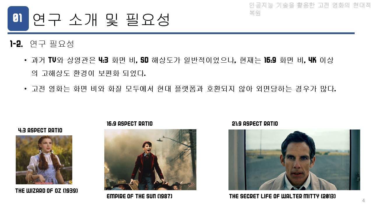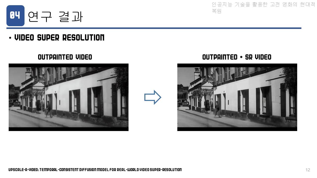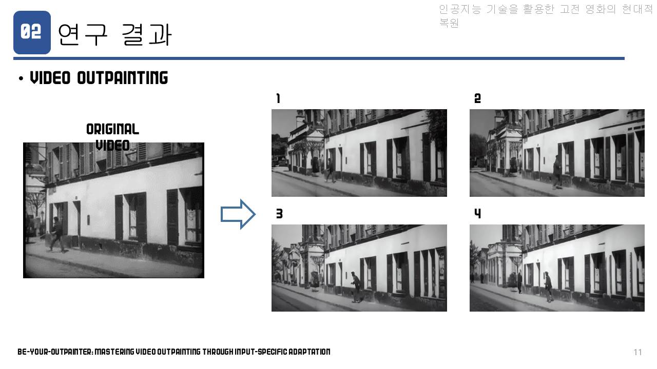 인공지능 기술을 활용한 고전 영화의 현대적 복원본 프로젝트는 인공지능 기반 기법을 활용하여 고전 영화의 디지털 복원 가능성을 탐구합니다. 연구의 핵심 목표는 해상도 향상과 와이드 화면 확장을 통해 현대 관람 환경에 부합하는 감상 경험을 제공하는 데 있습니다. 이를 위해 Be-Your-Outpainter 기반 Video Outpainting을 적용하여 자연스러운 비율 확장과 배경 보완을 구현하였습니다. 또한 Upscale-A-Video를 활용해 저해상도 원본을 FHD 이상(최대 4K) 수준으로 업스케일함으로써 영상 선명도를 개선하였습니다. 복원 결과물은 화질과 화면비 양 측면에서 유의미한 개선을 보였으며, 메타버스 등 디지털 플랫폼에서의 운용을 고려한 포맷 전환을 완료하였습니다. 본 연구는 예술과 공학의 융합적 접근을 통해 문화유산으로서의 고전 영화 가치를 보존하면서 동시대적 활용 가능성을 입증하였다. 향후 다양한 플랫폼 확산과 장기 보존 체계 구축의 기반 기술로 기여할 수 있을 것으로 기대됩니다.