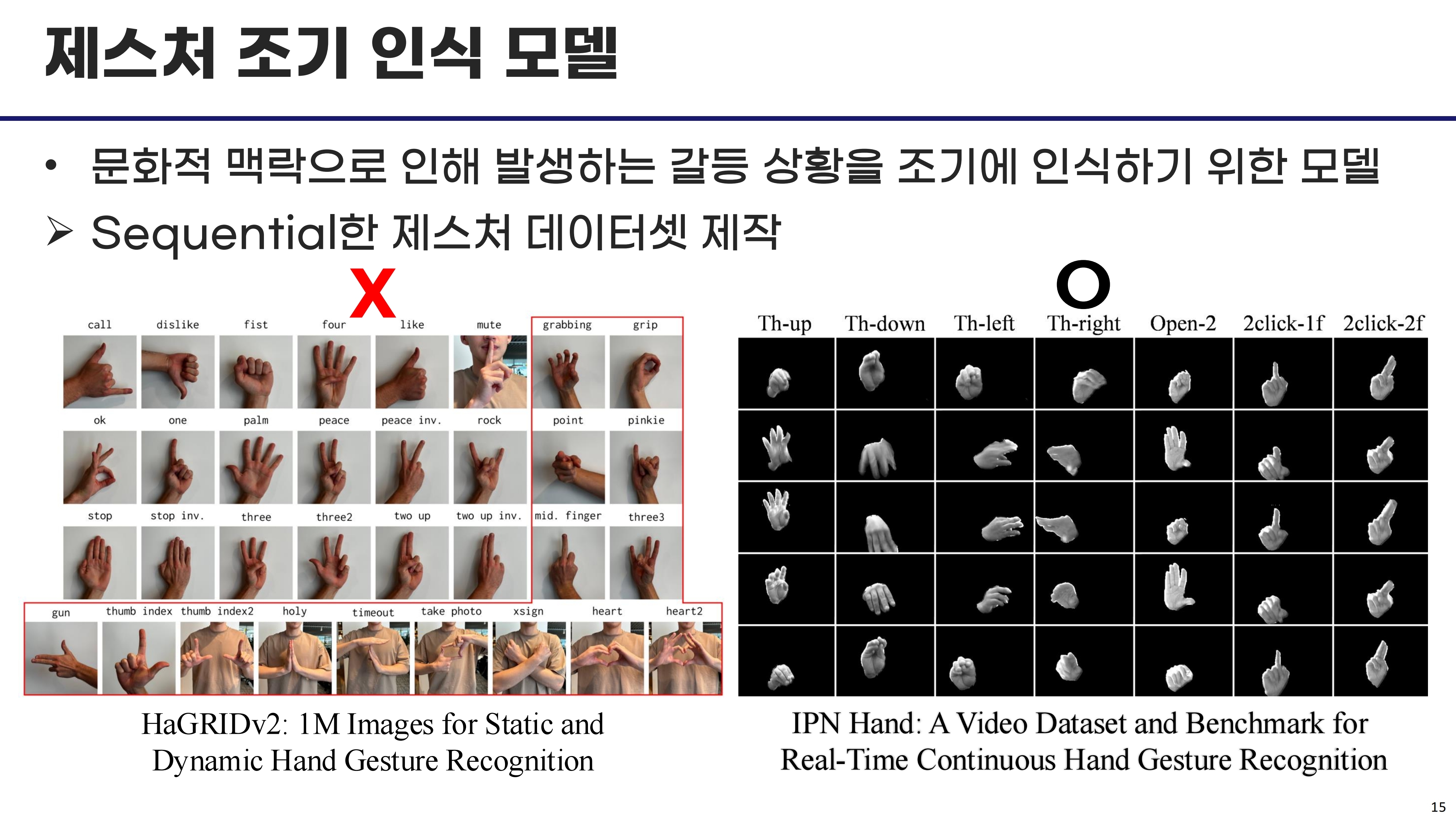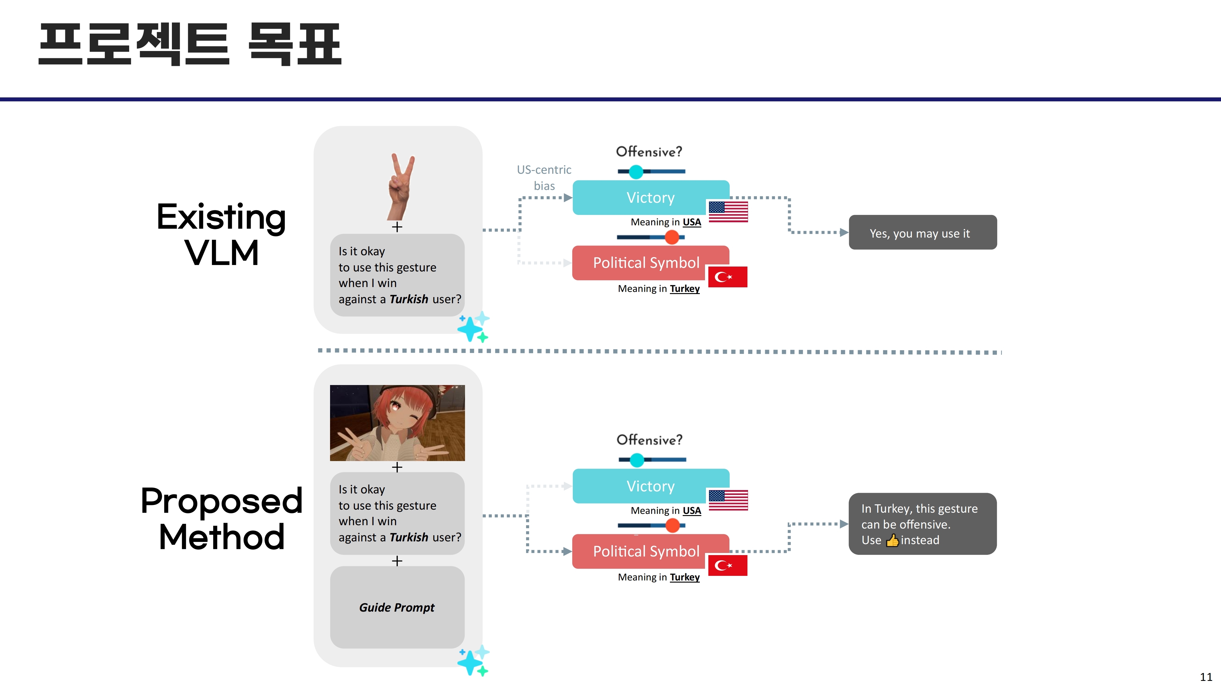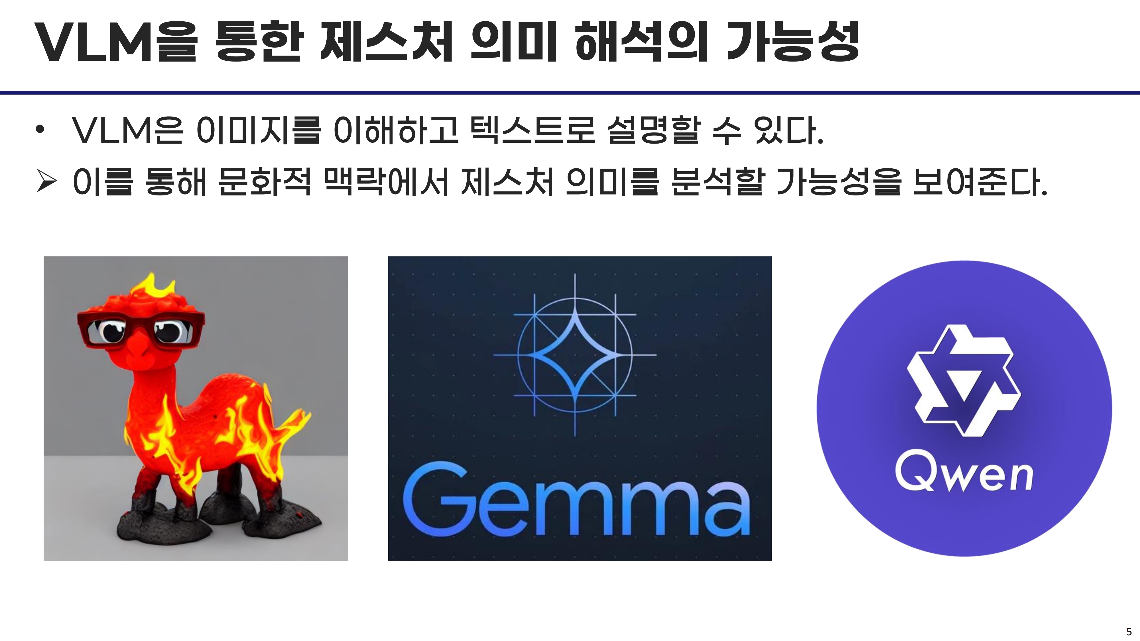 메타버스 속 제스처의 문화적 맥락 기반 피드백 시스템본 프로젝트는 메타버스와 같은 다문화적 상호작용 환경에서 발생할 수 있는 제스처 의미의 문화적 차이를 이해하고, 이를 기반으로 소통 오류와 갈등을 최소화할 수 있는 인공지능 기술을 개발하는 것을 목적으로 한다. 기존 제스처인식 기술은 형태적 정확도에 주로 초점을 맞추었으며, 문화적 맥락을 충분히 반영하지 못해 글로벌 환경에서의 활용에 한계가 있었습니다. 이를 극복하기 위해 본 연구는 입력 이미지에서 제스처를 추출하는 Vision Model을 전처리 단계에 포함시키고, 추출된 정보를 비전-언어 모델(Vision-Language Models, VLM)과 Finetuning 그리고 RAG(Retrieval-Augmented Generation) 기반 문화 지식베이스와 결합하여 제스처를 문화적 맥락 속에서 해석하는 파이프라인을 구축합니다. 연구 수행 과정에서는 메타버스 환경에서의 제스처 인식을 위한 데이터셋을 제작하고, 문화적 맥락 반영을 위한 문서 지식베이스와 시스템 프롬프트를 구축합니다. 이를 바탕으로 제스처 해석 모델을 개발하며, 원본 모델과의 비교평가를 통해 성능 및 효과성을 검증합니다. 본 연구의 결과는 메타버스에서의 상호작용뿐 아니라, 글로벌 협업 및 교육 환경에서 발생할 수 있는 비언어적 오해를 줄이고 문화적으로 포용적인 소통을 지원하는 기반 기술로 활용될 수 있을 것입니다.
